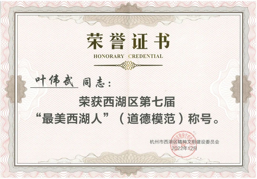 董事長葉偉武榮獲西湖區第七屆“最美西湖人”(道德模范)稱號