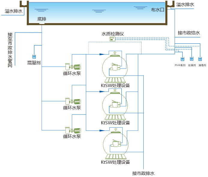 游泳池池水的循環(huán)過濾消毒就是其水處理工藝流程,游泳池池水處理的特點是循環(huán)過濾,其設(shè)計要點是循環(huán)水流量和循環(huán)周期問題,還有給水口、回水口的分布以使均勻布水問題,死水區(qū)和短流的問題。