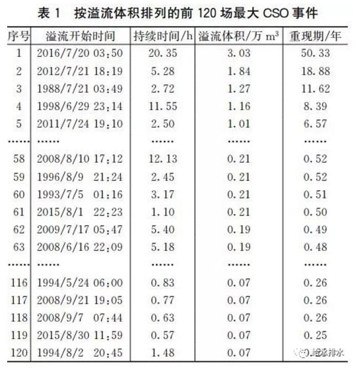 對采用模型連續(xù)模擬得到的溢流排水口多年溢流體積和峰值流量數(shù)據(jù)進行統(tǒng)計分析,建立溢流體積、峰值流量與對應(yīng)重現(xiàn)期的關(guān)系曲線,從而得到達到某年均溢流頻次(如1年不超過3次)等控制標準的CSO調(diào)蓄池池容和設(shè)計進水流量,或得到CSO處理站/廠的設(shè)計處理流量。