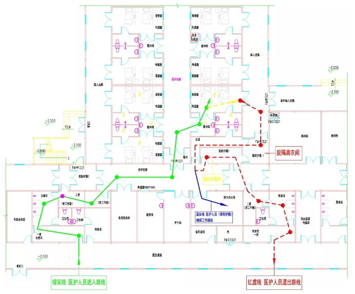 如圖3下側區域為防護區,主要為清潔走廊及辦公區,理論上此區域內醫護人員是可以只穿工作服的;與指廊病房相鄰的一側為醫護走廊,此區域內醫護人員必穿防護服;指廊部分為各病房護理單元,醫護人員在此工作區內除了穿防護服外,外面還要穿一層隔離衣,病房護理單元又分為3個區:內走廊為醫護走廊,為潛在污染區,病房為污染區,病人走廊(外走廊)最初從管理的角度考慮,設計成開敞圍廊,后更改為醫生進入病房后的退出通道,醫院管理方認為,只要醫護人員進入了病房,就被污染,不能原路返回,應該脫掉最外層的隔離衣后才能走入醫護走廊。病人走廊區域實為半污染走道,醫院管理方按可開啟空間考慮。