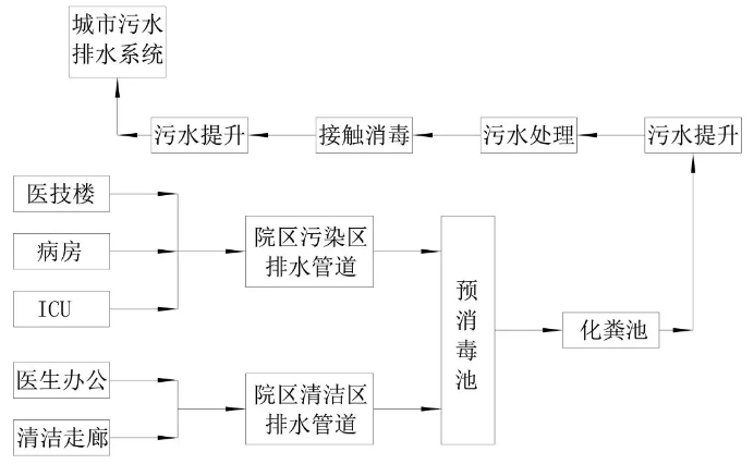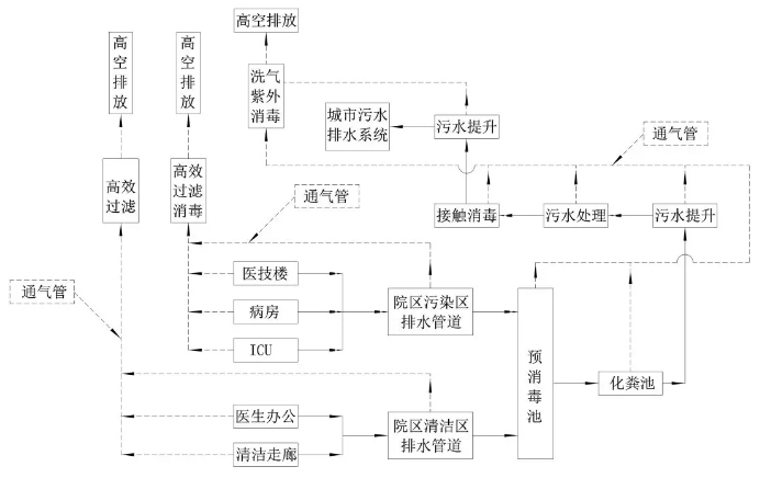 室外生活排水與雨水排水系統采用分流制,污染區的污廢水與清潔區污廢水分流排放,如病房、醫技和ICU等與辦公區、清潔走廊等衛生器具和裝置的污廢水與排水通氣系統均獨立設置,且污廢水各自獨立排放至預消毒池。為此,首先需要根據醫療設施建筑功能分區、醫療流程布局對清潔區與污染區進行清楚地劃分,限制區污廢水可排入清潔區排水系統。