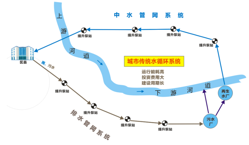 雖然很多污水處理廠有了美麗的外衣,但城市內(nèi)河缺少生態(tài)補(bǔ)水的問題依然存在。隨著群眾對(duì)生活環(huán)境要求的提高,河長(zhǎng)制的不斷深化推進(jìn),內(nèi)河缺水問題凸顯,建立中水管網(wǎng)系統(tǒng)成為城市河道補(bǔ)水的重要工程。傳統(tǒng)方法是在集中污水處理廠出水端建立再生水廠并通過補(bǔ)水管道進(jìn)行河道補(bǔ)水,但由于大部分集中污水處理廠位于城市中心下游30km的距離,遠(yuǎn)距離輸送能耗高,而且回用管道鋪設(shè)成本高,在推行過程中難度很大(見圖1)。