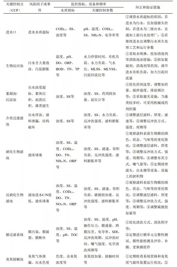 《水回用導(dǎo)則 再生水廠水質(zhì)管理》首次將HACCP體系引入再生水廠水質(zhì)管理。針對(duì)再生水廠水源水質(zhì)復(fù)雜多變、處理環(huán)節(jié)長(zhǎng)等特點(diǎn),為滿足再生水水質(zhì)安全保障需求,再生水廠應(yīng)根據(jù)水源特點(diǎn)、處理工藝和水質(zhì)管理目標(biāo),基于風(fēng)險(xiǎn)分析與關(guān)鍵控制點(diǎn)(HACCP)體系,制定再生水廠水質(zhì)管理措施。水質(zhì)管理措施包括風(fēng)險(xiǎn)識(shí)別、CCP設(shè)置和管理、水質(zhì)異常應(yīng)對(duì)措施、可持續(xù)改進(jìn)、應(yīng)急管理等方面,其制定流程如圖2所示。再生水廠的潛在風(fēng)險(xiǎn)、CCP監(jiān)控指標(biāo)及水質(zhì)異常應(yīng)對(duì)措施示例如表1所示。當(dāng)CCP的水質(zhì)指標(biāo)和控制參數(shù)超出目標(biāo)范圍時(shí),應(yīng)及時(shí)采取應(yīng)對(duì)措施,使其盡快恢復(fù)正常運(yùn)行狀態(tài)。