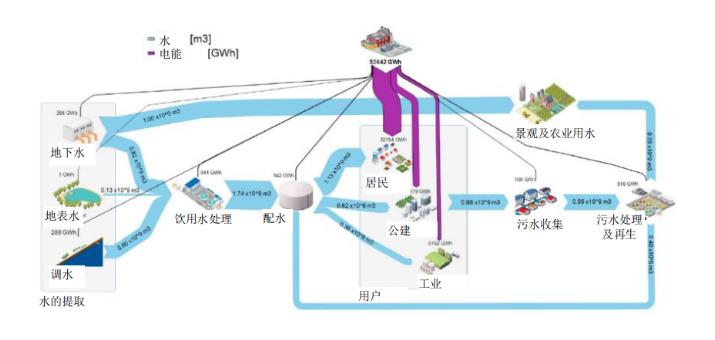 2所示給出了北京2015年水系統水量與能耗分配關系桑基圖,可以評估城市“水足跡”過程及能量消耗,在城市尺度上系統評估和多目標優化“水-能”關系,通過水系統全流程過程系統規劃、聚焦水循環每個鏈條,進行傳統工藝改進、高效設備及革新性工藝技術應用,尤其是對排水系統結構優化進而提升系統能源利用效率,因地制宜地采用污水中資源、能量回收以及清潔能源提取和利用等技術措施,進一步降低水系統能耗和溫室氣體排放,對于提升水系統韌性及可持續至關重要。