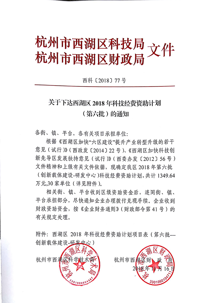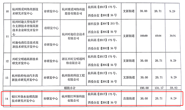 恭喜銀江環保榮獲政府資助30.5萬,其中銀江環保水處理高新技術研究開發中心獲西湖區2018年科技經費資助30萬,一體化高效能污水處理器發明專利獲西湖區科技資助0.5萬。
