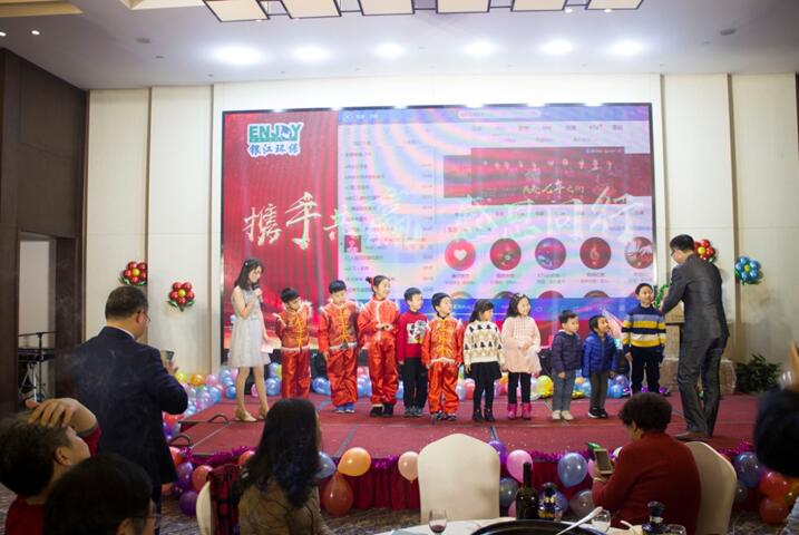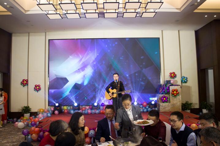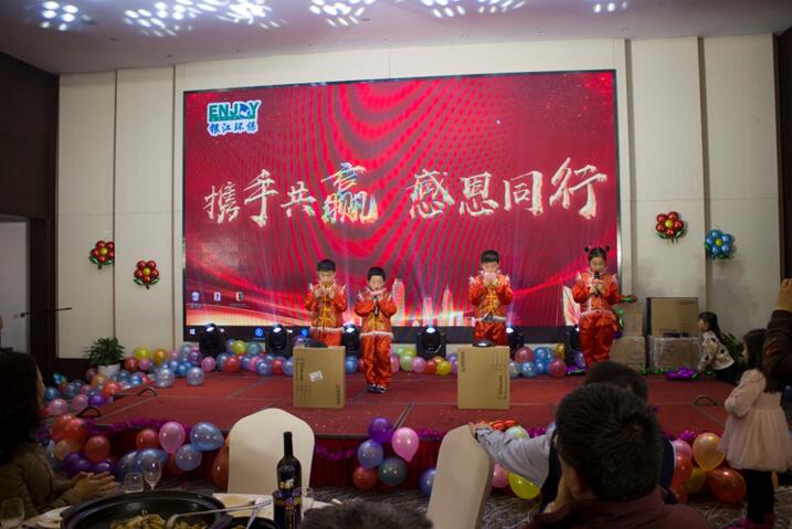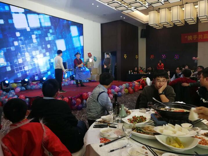 晚餐和文藝節目同時進行,舞蹈《CC哩》拉開晚會序幕,銀江吉祥寶寶如意也閃亮登場。隨后,歌曲、彈唱、藏舞、合唱、三句半、魔術、游戲、抽獎、優秀員工頒獎等穿插進行。