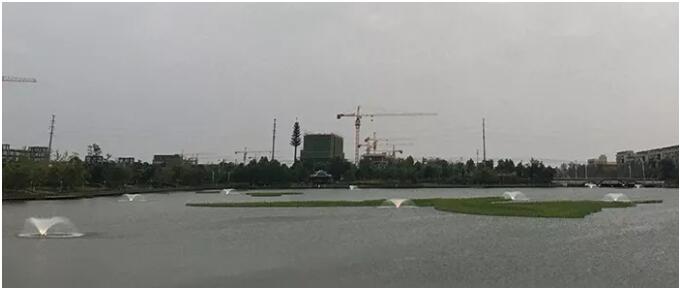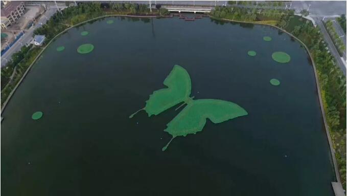 在彩蝶湖內部設置生態浮島約6000平方,其中大型彩蝶浮島總面積約為3500平方,其余圓形浮島共約2500平方,同時在彩蝶湖內設置12臺噴泉曝氣機,對彩蝶湖進行增氧曝氣,提升彩蝶湖整體景觀效果