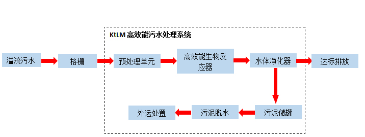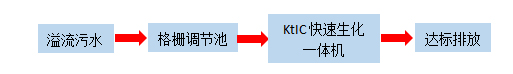 溢流生活污水經(jīng)格柵調(diào)節(jié)池后進(jìn)入KtIC快速生化一體機(jī)進(jìn)行處理。設(shè)備內(nèi)部設(shè)置缺氧區(qū)、兼氧區(qū)、好氧區(qū)、泥水分離、消毒,經(jīng)處理后的污水達(dá)標(biāo)排放。