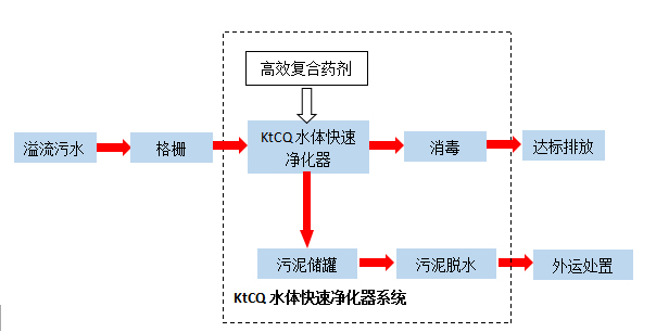溢流污水經(jīng)提升泵進(jìn)入KtCQ水體快速凈化器前段的配水槽,污水流經(jīng)配水槽時(shí)與高效復(fù)合藥劑混合進(jìn)入攪拌反應(yīng)池,反應(yīng)絮體聚合為大的礬花,并利用絮體層流分流技術(shù),形成二次絮凝反應(yīng),提高分離效率。再通過設(shè)備底部斜板沉淀進(jìn)行泥水分離,同時(shí)通入微納米氣體,將水中剩余的的懸浮物或油浮出水面,從而達(dá)到雙重固液分離之目的,污水經(jīng)消毒后,達(dá)標(biāo)排放,污泥浮渣進(jìn)入污泥槽,經(jīng)污泥泵送至污泥脫水設(shè)備處理。