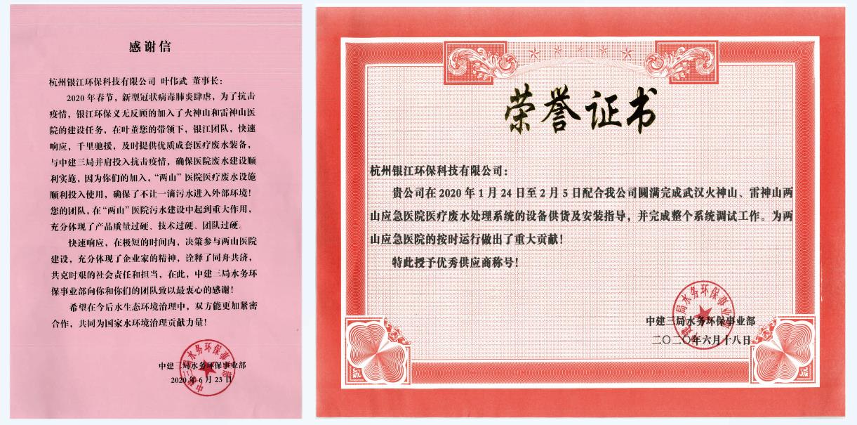 中建三局頒發給銀江環保的感謝信和榮譽證書