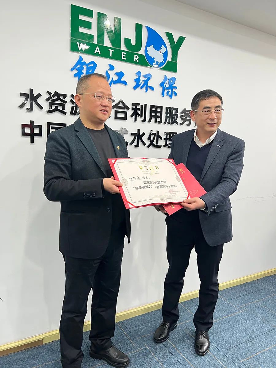 1月13日上午,西湖區(qū)領(lǐng)導(dǎo)走訪銀江環(huán)保,區(qū)委副書記陸志敏為董事長葉偉武頒發(fā)西湖區(qū)第七屆“最美西湖人”(道德模范)稱號榮譽證書。